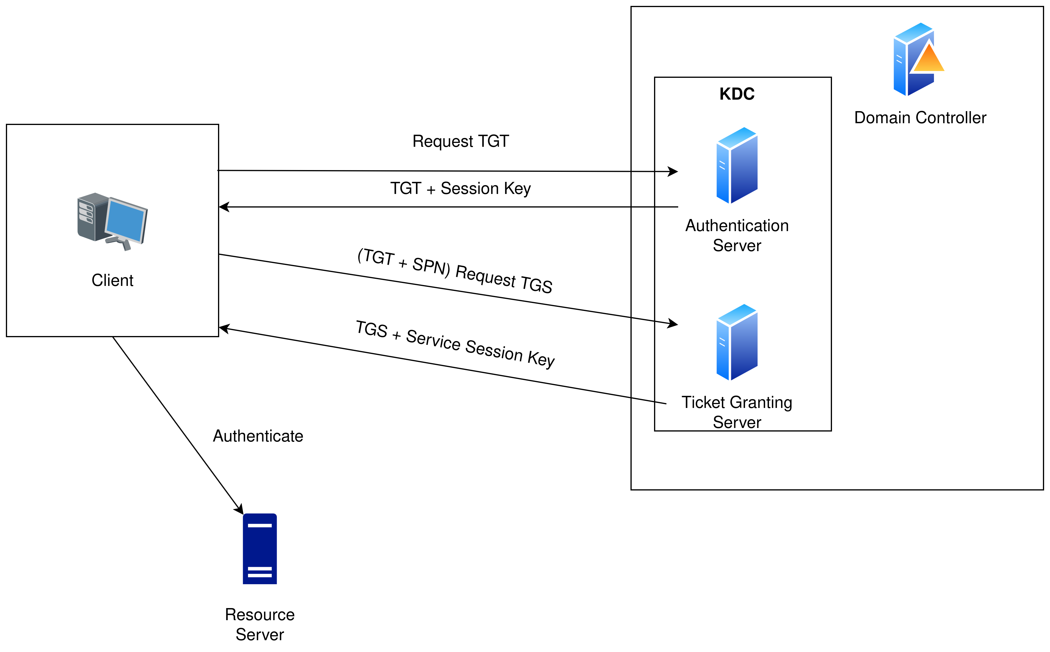 Request TGT (AS-REQ): The user sends their username and a timestamp encrypted with a key derived from their password to the KDC’s Authentication Service (AS), requesting a Ticket Granting Ticket (TGT).