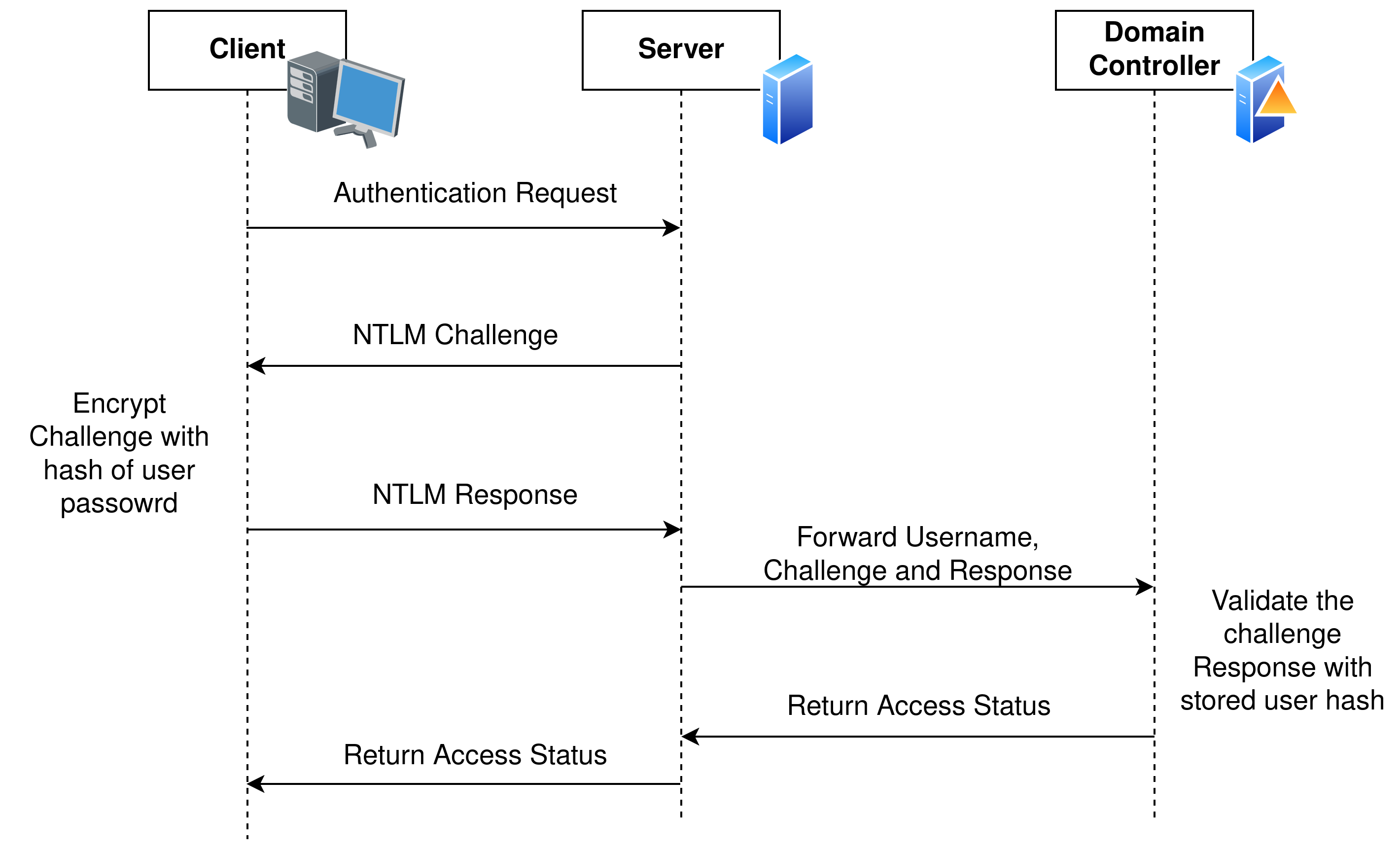 Server forwards to the Domain Controller (DC) The server doesn’t know if the response is valid, so it forwards the username, the challenge it issued, and the client’s response to a domain controller.